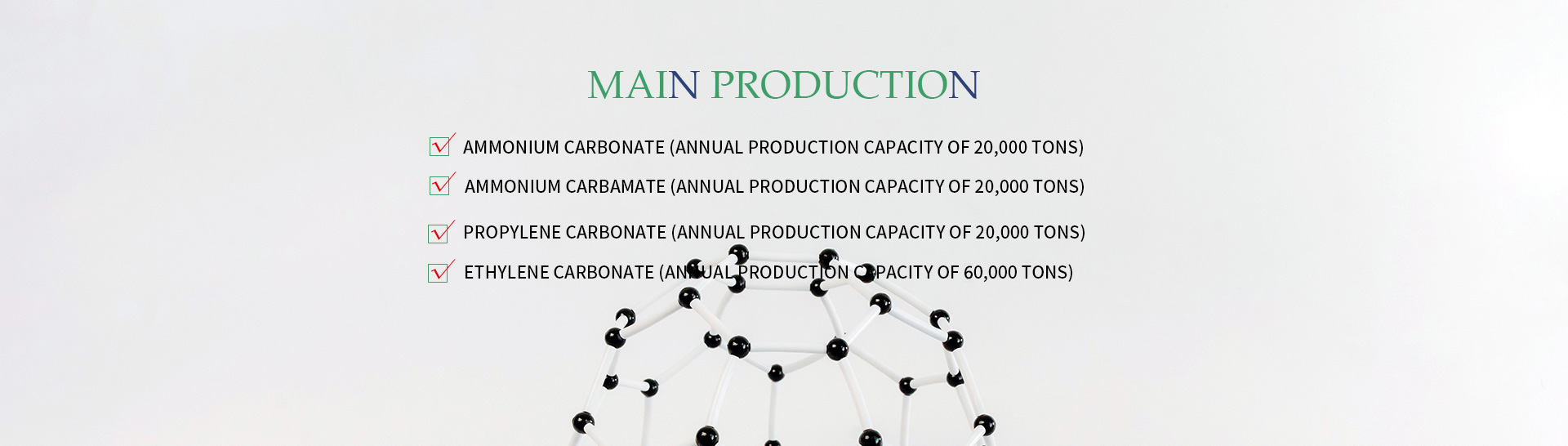 The company mainly produces ammonium carbonate (annual production capacity of 20,000 tons), ammonium carbamate (annual production capacity of 20,000 tons), propylene carbonate (annual production capacity of 20,000 tons), and ethylene carbonate (annual production capacity of 60,000 tons)